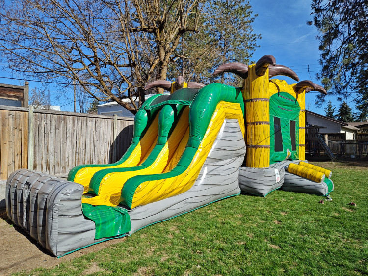 This bounce house/water slide combo features a bounce house area with a double lane water slide ending with a pool.